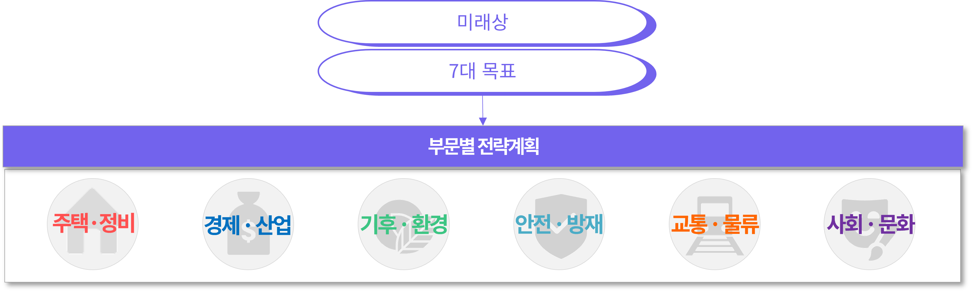 2040 서울도시기본계획에서는 미래상과 7개 목표를 실현할 실효성 있는 계획수립 방향을 제시하고, 서울시 실·국·본부의 정책 수립과정에 지침이 될 수 있는 '서울형 부문별 전략계획'을 구성하였습니다.