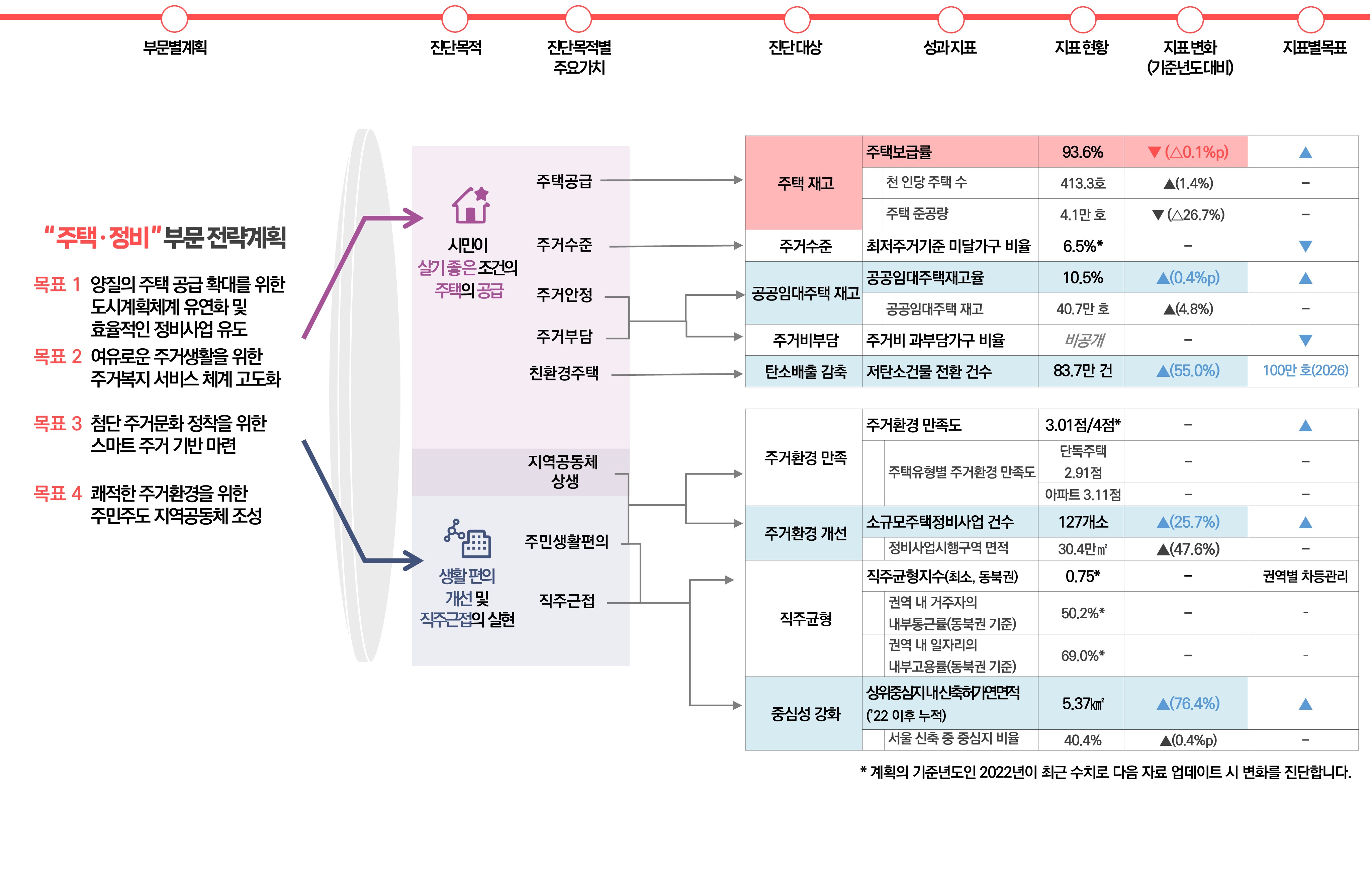 | 주택정비 | 주택 재고 | 주택보급률 | 93.60% | ▼ (△0.1%p) | ▲ | |
