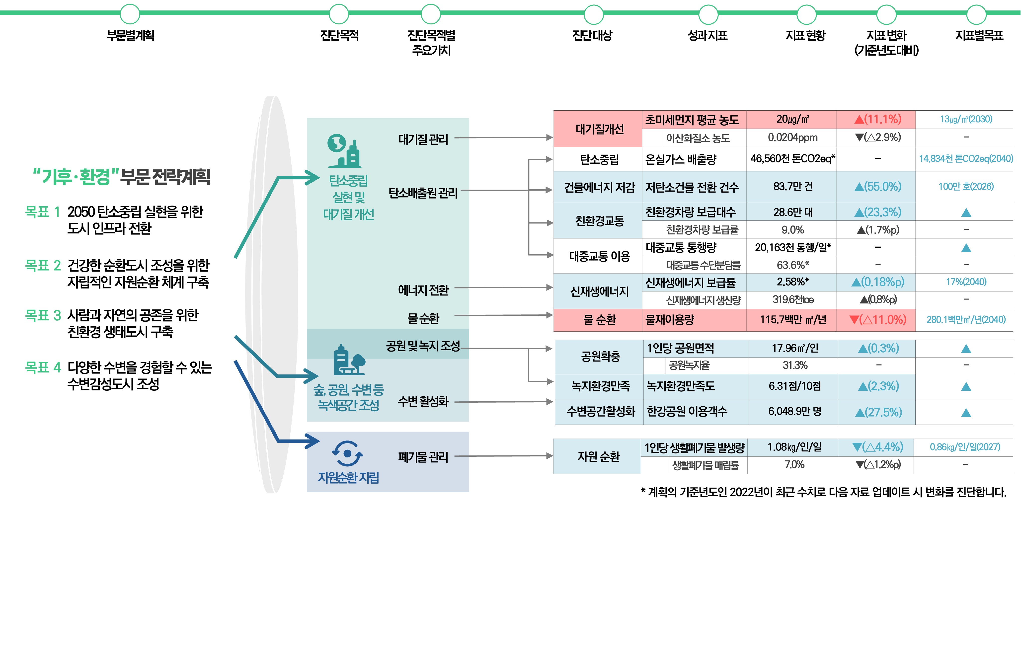 | 기후환경 | 대기질개선 | 초미세먼지 평균 농도 | 20㎍/㎥ | ▲(11.1%) | 13㎍/㎥(2030) | |